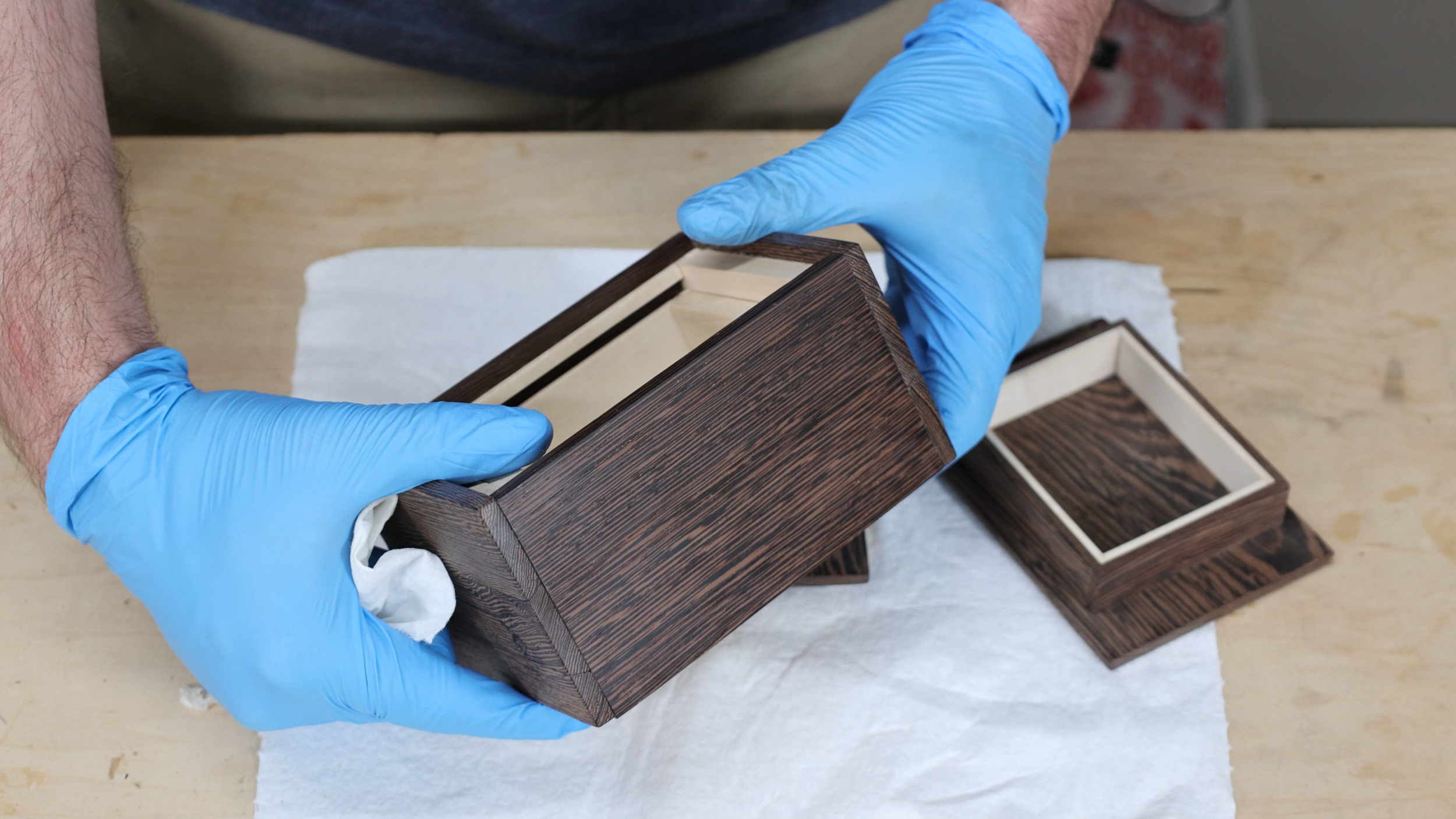 Unlike traditional Japanese puzzle boxes, I opted for wenge on the outside instead of colorful veneer. I used maple on the inside so there is a pop of color when the box is being opened. After performing the 12 steps, the person opening it gains access to the main compartment and also a secret drawer underneath the box.
