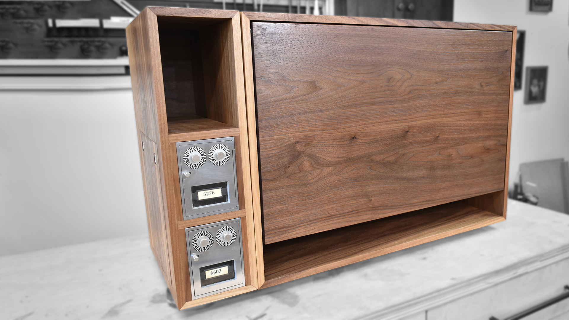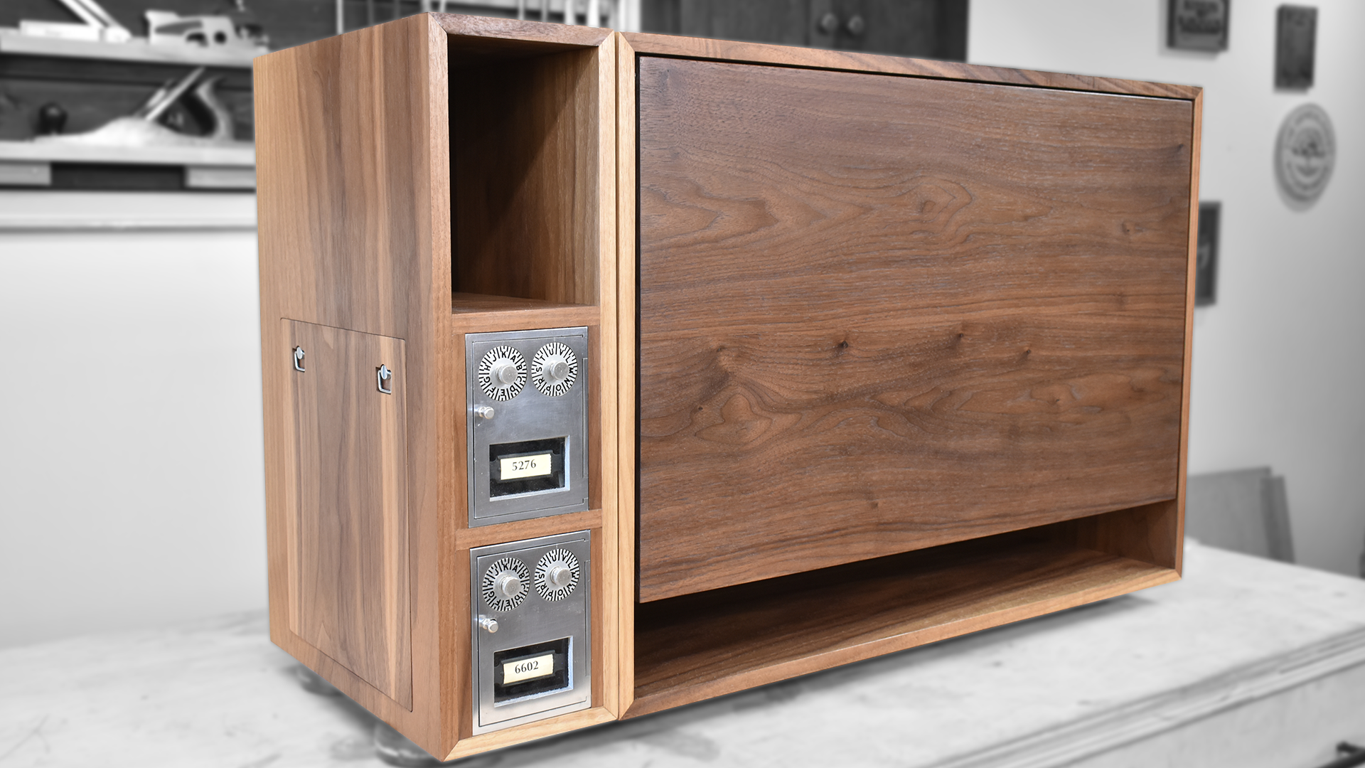 Post Box Media CabinetWalnut media center with pivoting door, waterfall joinery, and inlaid antique post box doors. View fullsize View fullsize View fullsize See the build video and read more about this project in my blog: Post Box Media Cabinet.